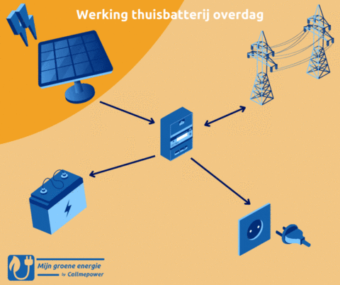 Zodra een productie installatie van groene energie elektriciteit opwekt en deze elektriciteit niet direct wordt verbruikt, zal hiermee de thuisbatterij worden opgeladen. Vervolgens kan deze elektriciteit op een later moment worden gebruikt.